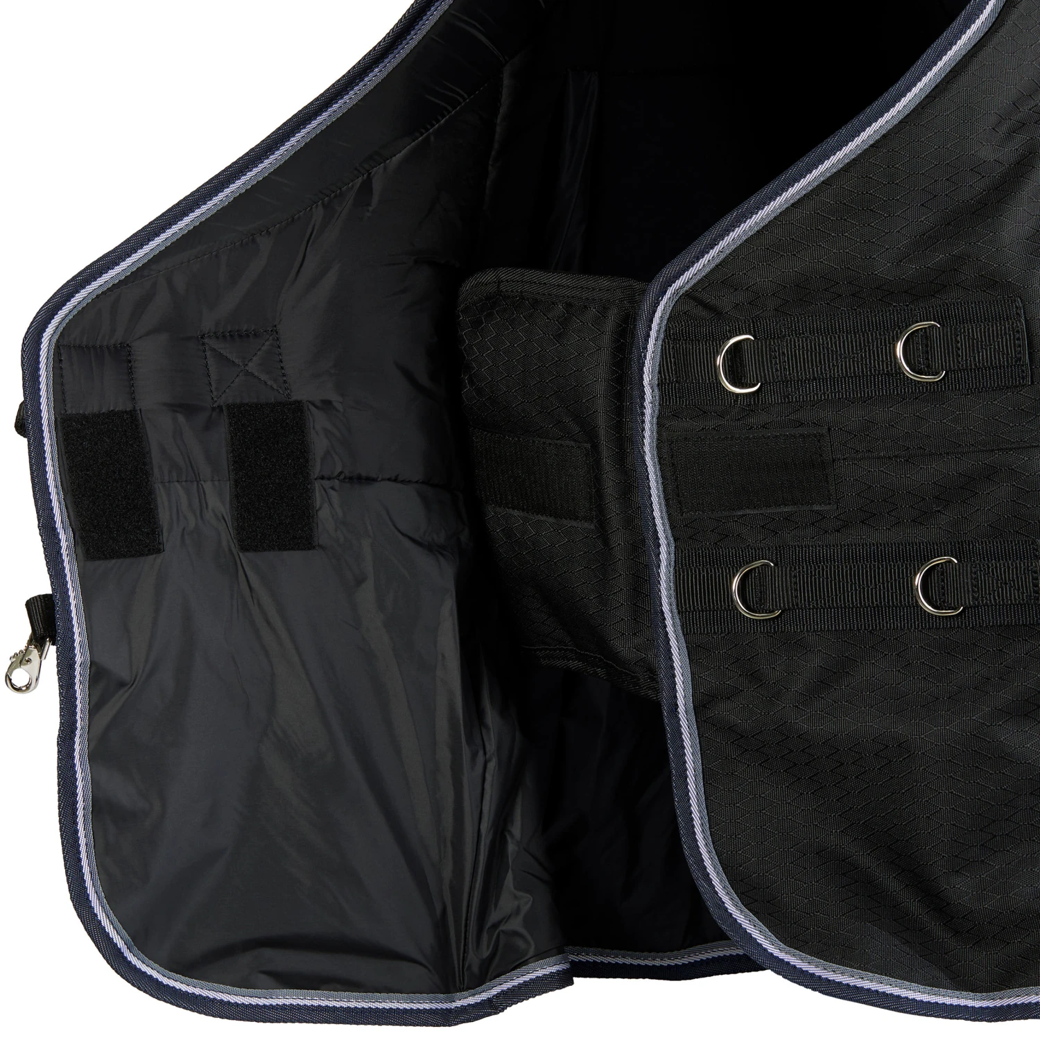 Other fastenings: adjustable cross surcingles. The hook-and-eye fastenings on the cross surcingles are equipped with rubber rein stops that prevent them from coming undone unexpectedly.